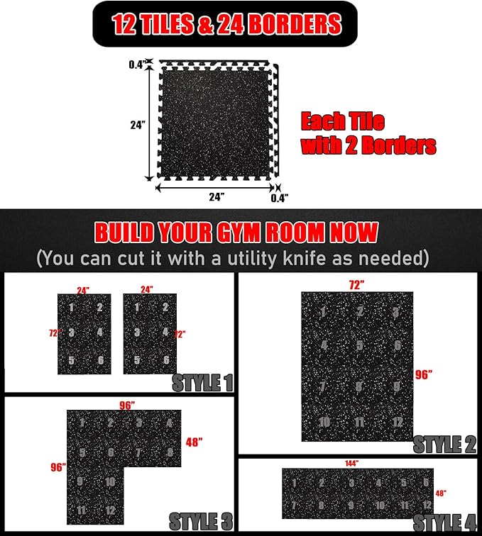 - UILD YOUR GYM ROOM NOW! It includes 12 tiles, 24 detachable borders. Each mat measures approximately 24" x 24" x 0.6". Each mat weighs 2.5 pounds. The total coverage area of 12 tiles is 48 square feet. Our floor mat is suitable for garage, gym, family fitness room or playroom. The toothed design of the tiles makes them easy to interlock or detach. You can also use knife to cut and adjust the mat according to your own room, making it fit any shape of fitness area.