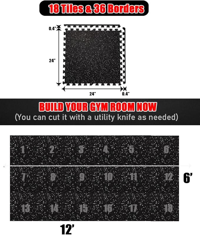 - BUILD YOUR GYM ROOM NOW! It includes 18 tiles, 36 detachable borders. Each mat measures approximately 24" x 24" x 0.6". Each mat weighs 2.5 pounds. The total coverage area of 18 tiles is 72 square feet. Our floor mat is suitable for garage, gym, family fitness room or playroom. The toothed design of the tiles makes them easy to interlock or detach. You can also use knife to cut and adjust the mat according to your own room, making it fit any shape of fitness area.