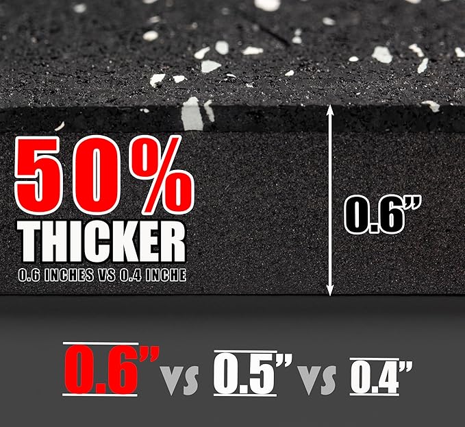 - EXTRA THICK DESIGN - Our mats have a thickness of 0.6", which is 50% thicker than the standard 0.4" mats. Undoubtedly, thicker mats can provide better cushioning and support, making the workout quieter and more comfortable. Moreover, they have a longer lispan, making them a great home gym choice. Whether it's HIIT training, yoga, weightlifting, or even wrestling, this mat meets your needs. It’s the ideal mat for fitness benches, kettlebell support, treadmills, and other exercise equipment. .
