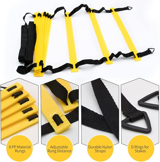 • 【Ideal Exercise Tool】- This agility ladder set includes everything you need to whip yourself into shape. It includes 4pcs 13ft 8 rungs agility ladder, 16pcs steel stakes for added stability, and 4pcs carry bag.