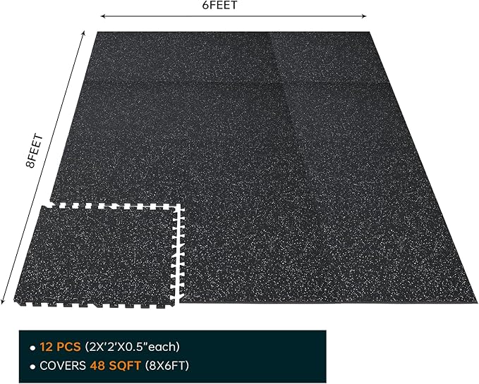 - 🌟 【Rubber Mats interlocking 】 Each pack comes with 12 tiles and 24 borders to cover 48 square feet. It is easy to assemble making a perfect workout and training space. Each gym rubber flooring tile measures 24 inches x 24 inches x 1/2 inch. The puzzle exercise mats lock and grip together tightly so you can exercise without worrying about moving.