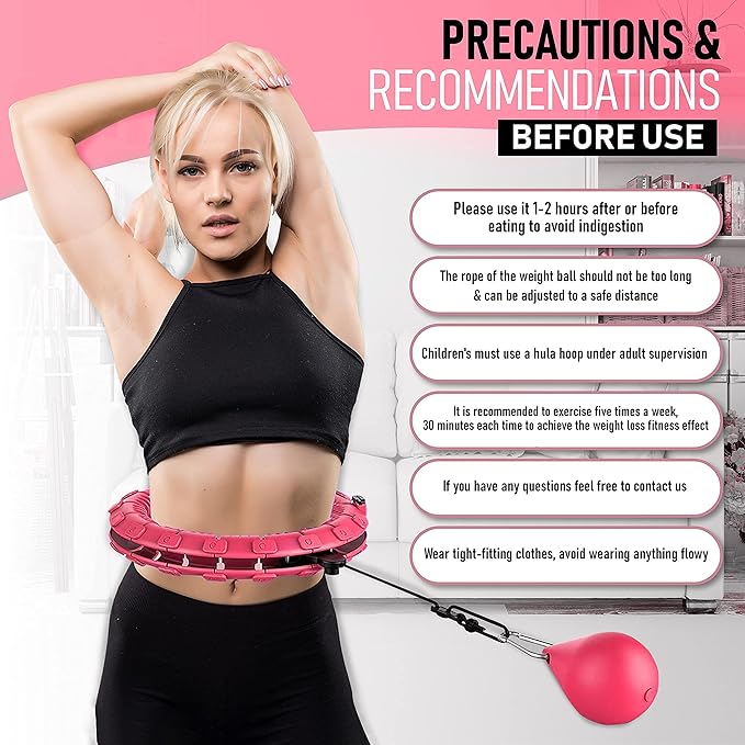 - [Restrictions using smart hulahoop] Almost suitable for all adults and kids but not the elderly or baby. It is best to give one hour gap between exercising and meals to prevent indigestion. Before exercising, ensure the hoola hoop linking is done and wear the close-fitting clothes;When exercising, it is best to find a relatively open place, so as not to accidentally injure others. Try standing legs shoulder-width apart, with one foot almost a foot in front of the other.