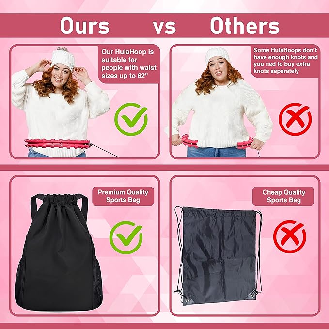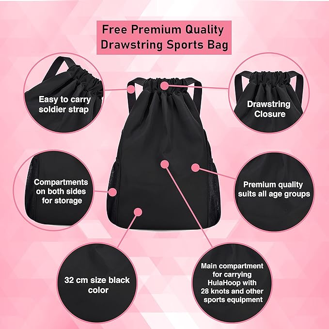 - [Carry in one of the Bestselling Sports bag] Get the smart weighted Hula Hoop bundled with an amazing black drawstring sports bag which not only allows you to carry the extra large Hula hoop but your additional exercising equipments as well. This sports bag makes it easy to hold weighted hula hoop for kids and adults, getting rid of the hassle to find an additional bag to carry Hula Hoop exercise belt. Take your Pilate ring anywhere and enjoy Hula hooping with friends, family or at gym.