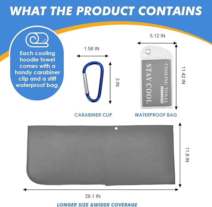 - 【EASY TO CARRY & CLEAN】 : Each cooling hoodie towel comes with a waterproof plastic pouch and a carabiner clip, allowing you to effortlessly carry it for sport, yoga, golf or working out. They're easy to store and conveniently attachable to sports bags and travel backpacks.During exercise, it can be used as neck cooling wrap, sweat-absorbent rag and more. Cold towels can be hand-washed or machine-washed and reused.