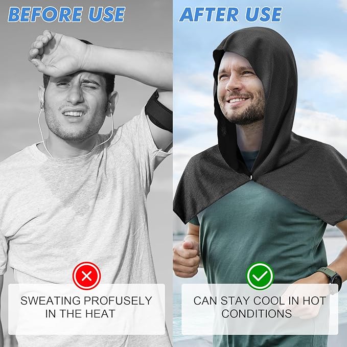 - 【MULTIFUNCTION】:This cooling hoodie towel is perfect for exercise enthusiasts who love yoga, sports, swimming, exercise, gym, golf, camping and fitness. It is also ideal for outdoor workers who work in hot weather. Using a cooling hoodie towel for your neck and face will help you avoid sunburn or heat stroke and bring you a refreshing. You can also use it to relieve the headache caused by fever, and the physical cooling of burns. It's a great summer accessories for any activities.