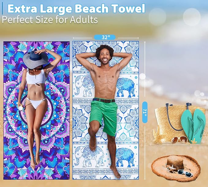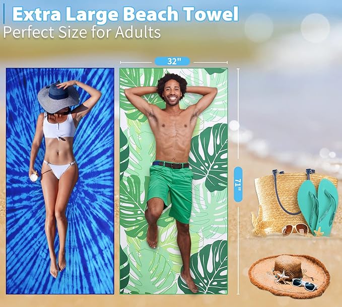 - Large Size and 2 Side Printed : 71 x 32 inch. In addition, we also have a unique beach towel pattern.Our beach towels have a strong color fastness,and the machine wash will not fade, the quality is good and suitable for women men and kids.We also offer 6 pack, 4 pack and 2 pack of beach towel for you to choose