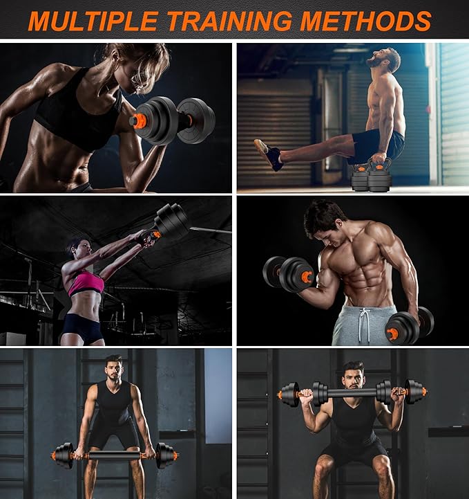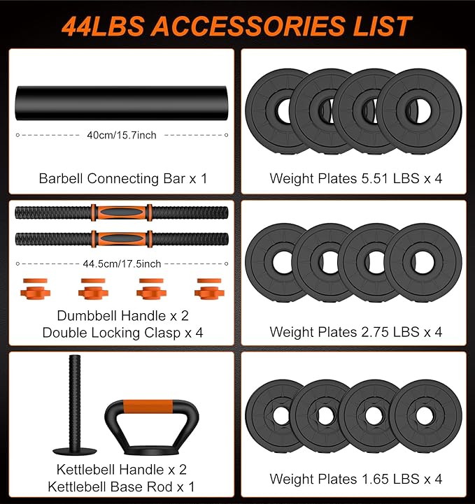 • 【Flexible Weight Options】: With a total weight of 44 pounds and adjustable dumbbell plates,(4pcs 5.5lbs, 4pcs 2.75lbs,4pcs 1.65lbs,2pcs dumbbell bar, 1pcs connector and 4pcs double nuts) you can tailor your workout intensity to your specific goals and fitness level. By converting dumbbells into barbells with connecting rods, one can engage in full body muscle exercises.