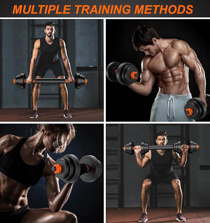 • 【Flexible Weight Options】: With a total weight of 44 pounds and adjustable dumbbell plates,(4pcs 5.5lbs, 4pcs 2.75lbs,4pcs 1.65lbs,2pcs dumbbell bar, 1pcs connector and 4pcs double nuts) you can tailor your workout intensity to your specific goals and fitness level. By converting dumbbells into barbells with connecting rods, one can engage in full body muscle exercises.