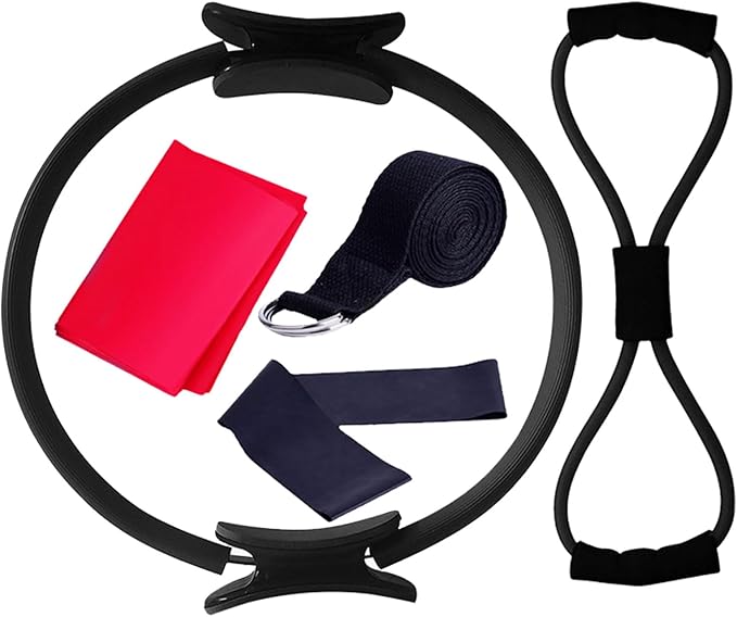 - PRODUCTS INCLUDED: Pilates ring, latex elastic band, yoga rally strap, pull rope, 8-shaped resistance bands for arms.
