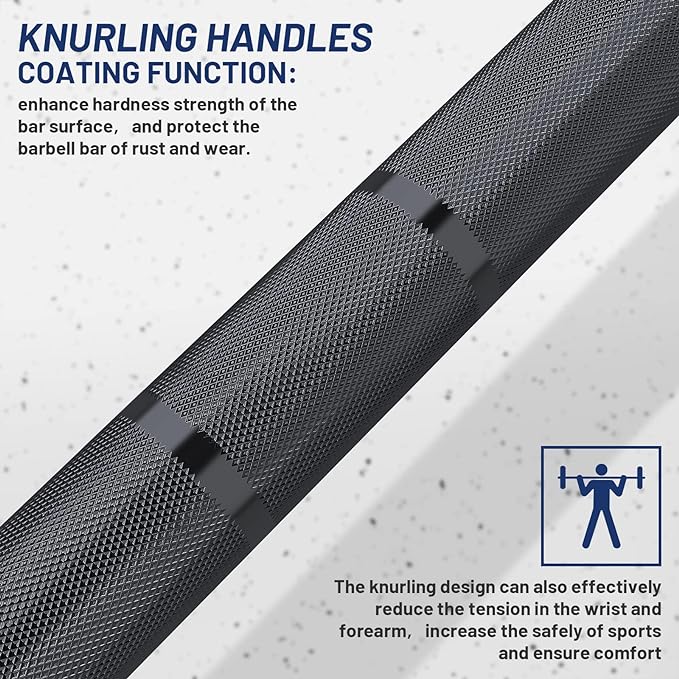 - [Medium Barbell Knurling] The 28mm grip shaft with a 1.2mm medium-level knurling, and have a moderate whip, increases friction and improves the grip experience. The knurling design can also effectively reduce the tension in the wrist and forearm, increase the safety of sports and ensure comfort