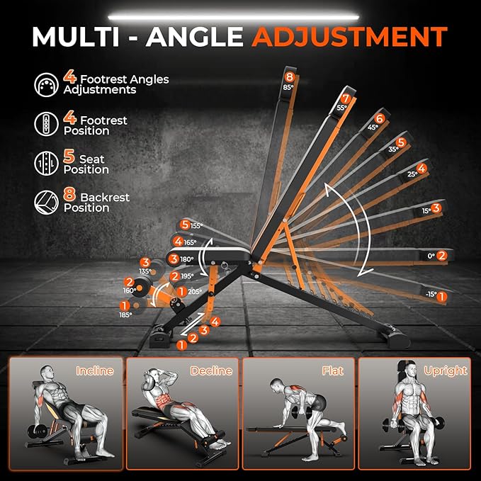 - 【Adjustable & Foldable Weight Bench】Designed with 8 backrest adjustments,5 Seat adjustments,4 footrest adjustments and 3 footrest angles adjustments, this adjustable weight bench offers penple a full-body workout to strengthen and tone all of your muscle groups to meet your fitness goals with ease. Foldable design makes you can store quickly under beds or in closets to save the space.