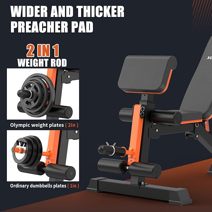 • 【VERSATILE ATTACHMENTS】Our weight bench includes additional leg developers and a preacher pad. The leg bar 2-in-1 features suitable for Olympic dumbbells (2 in) and is also compatible with regular dumbbells (1 in). This adds versatility to your workouts and enables you to perform an effective full body workout.