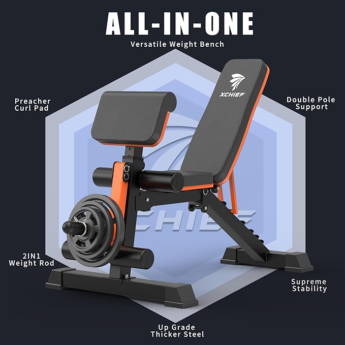 • 【FULLY ADJUSTABLE WEIGHT BENCH】The XCHIEF adjustable bench features 7 fast-adjustable backrest positions (including incline, decline, flat), 5 preacher pad positions, 3 pastor pad angles, and 3 foot positions. This versatile workout bench allows you to target specific muscle groups and customize your workout according to your fitness level.