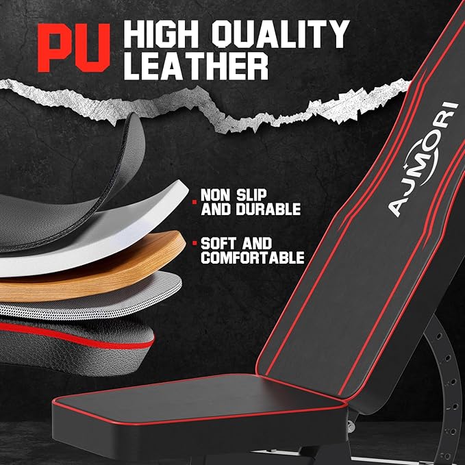 • 【Comfortable & Ergonomic Design】The Ajmori workout bench features the latest non-slip leather and 5 layers of high-density padding, The soft leather surface and high-density foam padding of the workout bench firmly immobilizes the body and reduces muscle fatigue during exercise. The workout bench supports your body during your workout so that you can perform various exercises in comfort.