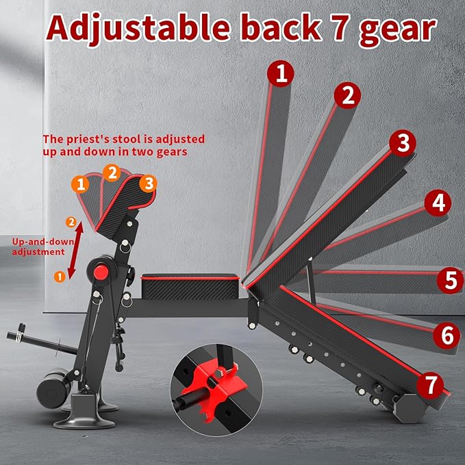 - [Adjustable Weigch Bench]: The dumbbell bench is designed with 7 backrest cushion positions and 3 stopper adjustments, easy to adjust, one second to complete the adjustment. You could switch to the right position at will during the exercise, effectively improve the effect and time of the whole body exercise and increase the muscle shaping effect