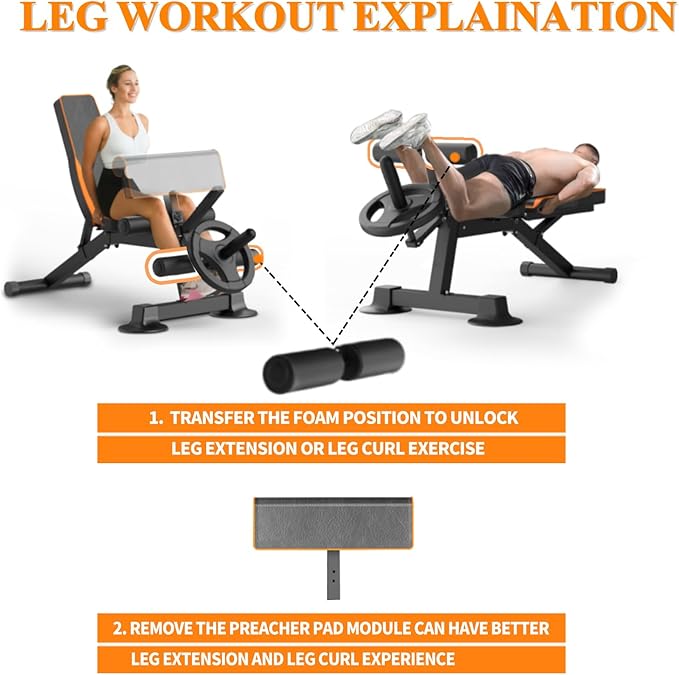 - 💪【LEG EXTENSION AND CURL】We set a height adjustment under the seat and can make a comfort height when do lying leg curl workout. When do these leg workout function, we suggest to remove the preacher pad subassembly. After long-term testing, the function is real, effective and comfortable.