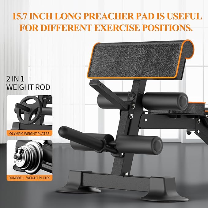 - 💪【SUPER SALE POINTS】:Adjustable weight bench space design conforms to the human body engineering,fitness enthusiasts of all heights have room to do exercises like leg extensions,the enlarged and lengthened double-deck preacher pad is very effective for the double hands dumbbell bending, roman chair abdomen bending and other functions. Whole bench leather is 1.4mm thickness,comfort and exquisite feeling far beyond competitors, 2 in 1 weight rod can fit dumbbell & Olympic weight plates..