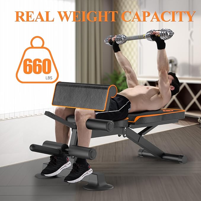 - 💪【MATERIAL & WEIGHT】: 50*50mm carbaon steel, 1.4mm thickness pipe as main frame pipe, ensure the steady form when you do workout. Our adjustable weight bench net weight is 20KG, 660LBS weight capacity, far beyond homeuse standard.