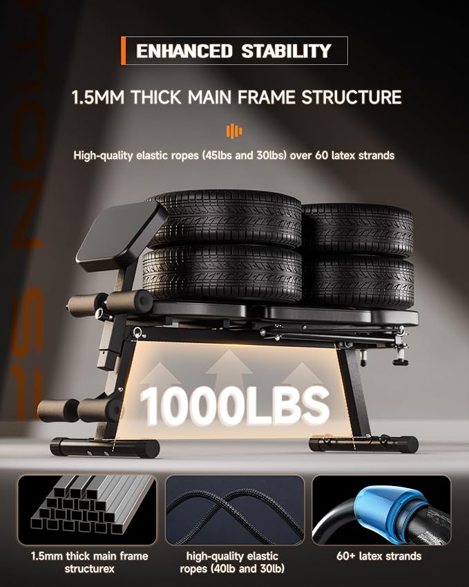 • 【Utility and Durability in Detail】The Motion Space Multifunctional Adjustable Fitness Bench features a one-click adjustment design, eliminating the need for rotation and making it more convenient to use. It is equipped with two sets of high-quality elastic ropes (40lbs and 30lbs) and over 60 latex strands, offering excellent elasticity and high resistance to tearing for enhanced safety.