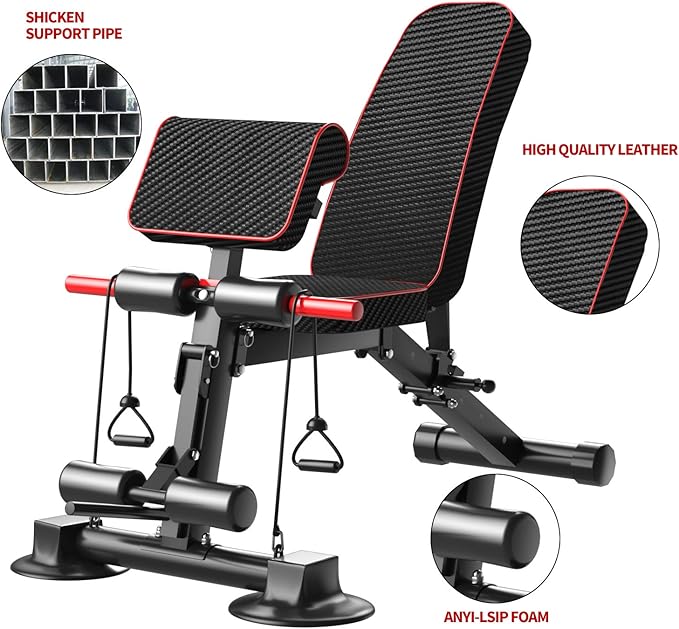 - ✅COMFORTABLE & ERGONOMIC DESIGN : Comfortable high-density foam padding and seat secures body firmly and reducing muscle fatigue during workout. This Weight Bench Features a soft leather which is filled with dense foam padding so it is comfortable to do multiple exercises.