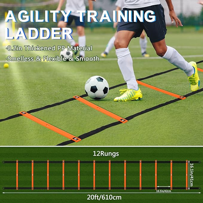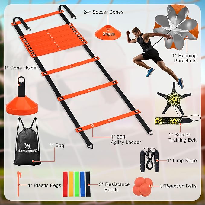 - Agility Training Equipment Kit: Includes 20 ft 12 rungs no tangle fixed-width agility ladder with fixable 4 stakes, resistance parachute, 24 yellow disc soccer cones with cone holder, 5 resistance bands, 3 reaction balls, solo soccer trainer belt, and jump rope.Whether you are a beginner or an expert, the speed training equipment can meet your training requirements