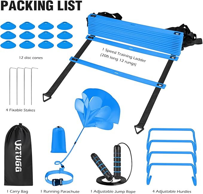 - 【Unlock Your Full Athletic Potential】Enhance your agility, speed, and coordination with our Agility Training Equipment Kit. Whether you're just starting out or a seasoned pro, this set has everything you need to level up your training game. From the 20-foot agility ladder to the adjustable hurdles and running parachute, each component is designed to push your limits and maximize your performance.