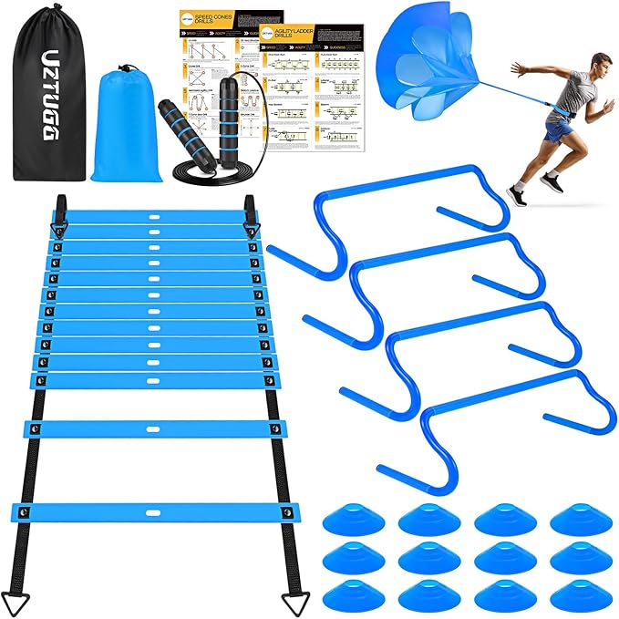 - 【Unlock Your Full Athletic Potential】Enhance your agility, speed, and coordination with our Agility Training Equipment Kit. Whether you're just starting out or a seasoned pro, this set has everything you need to level up your training game. From the 20-foot agility ladder to the adjustable hurdles and running parachute, each component is designed to push your limits and maximize your performance.