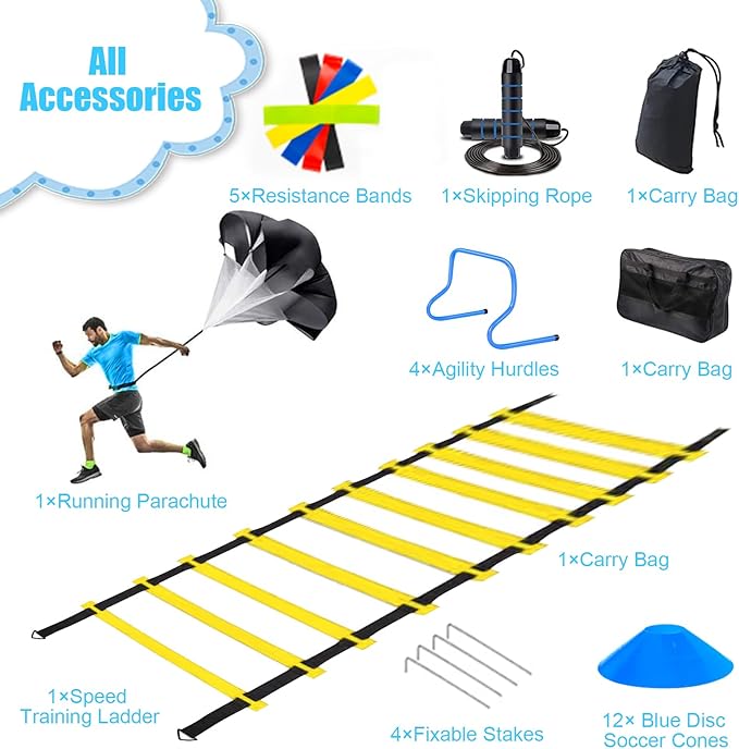 • Agility Training Equipment Set - Football agility training set includes: 1 Yellow Speed Training Ladder(20ft long 12 rungs) with 4 Fixable Stakes, 4 Blue Adjustbale Hurdles Training Equipment, 12 Blue Soccer Cones, 1 Running Parachute Speed Training, 1 Jump Rope, 5 Exercise Bands and 1 Carry Bag. Great football soccer basketball training equipment for youth.