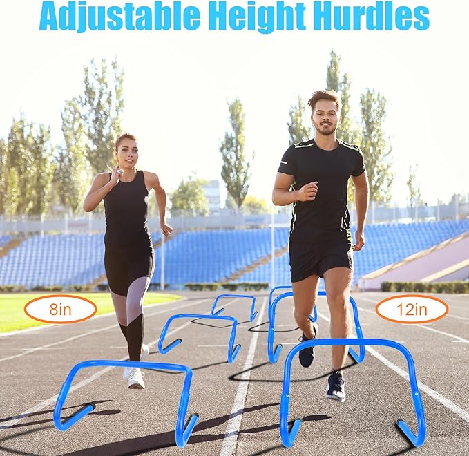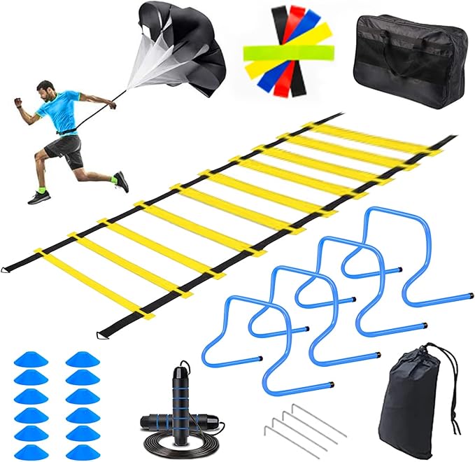 - Agility Training Equipment Set - Football agility training set includes: 1 Yellow Speed Training Ladder(20ft long 12 rungs) with 4 Fixable Stakes, 4 Blue Adjustbale Hurdles Training Equipment, 12 Blue Soccer Cones, 1 Running Parachute Speed Training, 1 Jump Rope, 5 Exercise Bands and 1 Carry Bag. Great football soccer basketball training equipment for youth.