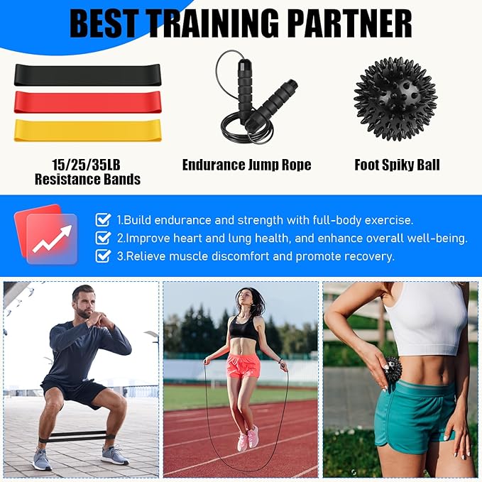 - " Unlock Your Potential" - This set is perfect for various leg training exercises including soccer, football, basketball, and baseball. It also allows for the creation of fun obstacle courses for both kids and adults, enhancing training potential. The spiked ball aids in post-training foot muscle relaxation and massage, reducing the risk of injury. The resistance bands (15, 25, 35LB) are made of skin-friendly latex, suitable for crab walks and squats to promote targeted muscle growth.