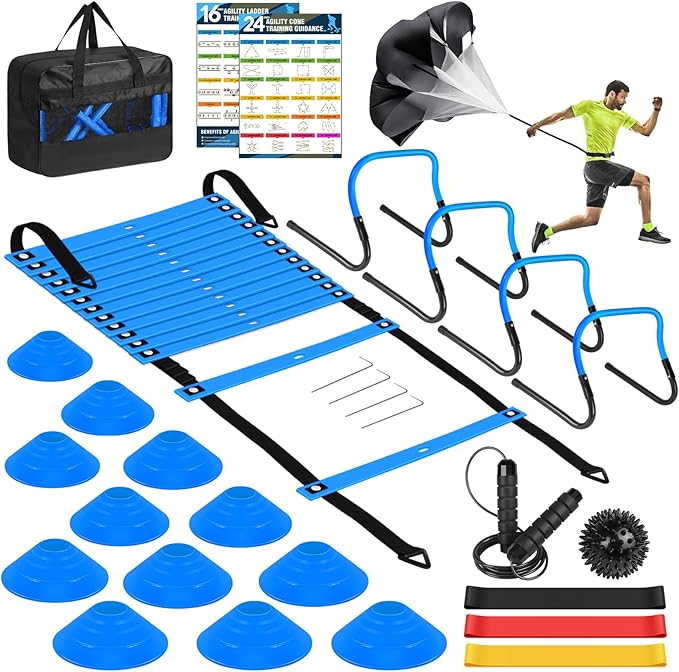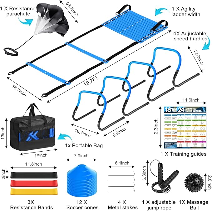 - " Comprehensive Agility Training Equipment Set " - The agility training set includes a 20-ft high-strength nylon agility ladder with soft and durable PE rungs, 4 adjustable-height ABS agility hurdles, 12 durable PE soccer training cones, 1 high-resistance running parachute, 1 professional jump rope, 1 spiked ball 3 latex leg resistance bands (15, 25, 35LB), and a detailed instruction manual. Whether you are a beginner or an expert, this agility training equipment meets all your training needs.