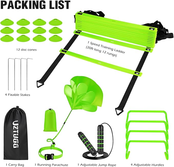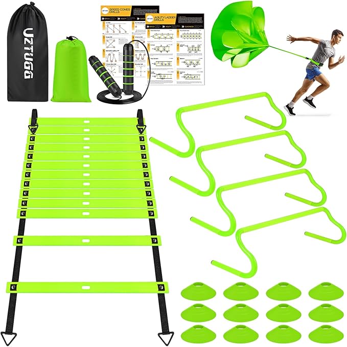 - 【Unlock Your Athletic Potential】Embark on a journey to unleash your inner athlete with our complete speed and agility training equipment bundle. Featuring top-notch gear like an advanced 20-foot agility ladder, hurdles, cones, jump rope, and a running parachute, this set is crafted to cater to both coaches and individuals seeking engaging and effective fitness routines.