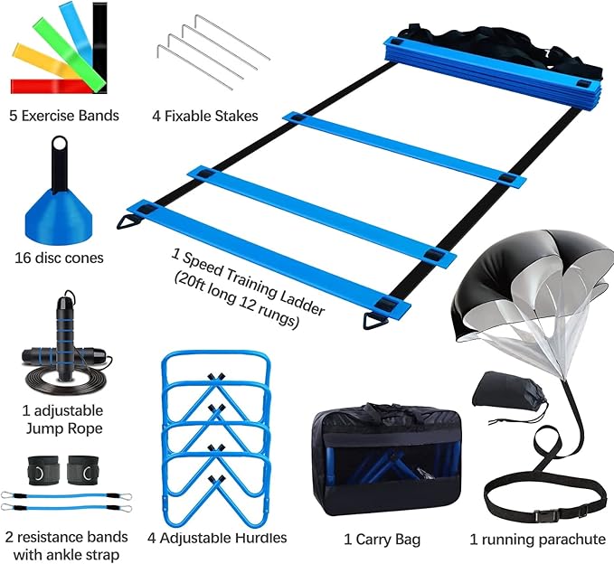 • ⚽【Agility Training Equipment Kit】Includes 1 Speed Training Ladder(20ft long 12 rungs) with 4 Fixable Stakes, 4 Adjustable Hurdles, 12 disc cones,2 resistance bands with ankle strap, 1 running parachute,5 Exercise Bands,1 Jump Rope,1 Carry Bag.The complete football training equipment for youth.