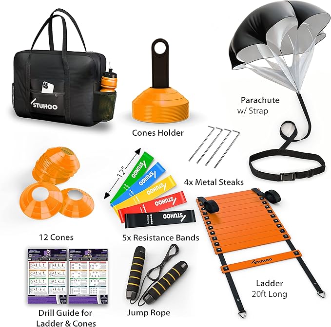 • 【The Perfect Agility Training Equipment Set】: STUHOO brings a versatile soccer training equipment that includes 20 ft Agility Ladder, Parachute for speed training, Jump Rope, 5 Resistance Bands, 12 Disc Cones with holder, 2 Double-Sided Drill Guides, & Polyester Gym Bag; our football training equipment comes with a passion to make your life more fitter