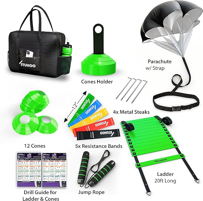 - 【The Perfect Agility Training Equipment Set】: STUHOO brings a versatile soccer training equipment that includes 20 ft Agility Ladder, Parachute for speed training, Jump Rope, 5 Resistance Bands, 12 Disc Cones with holder, 2 Double-Sided Drill Guides, & Polyester Gym Bag; our football training equipment comes with a passion to make your life more fitter