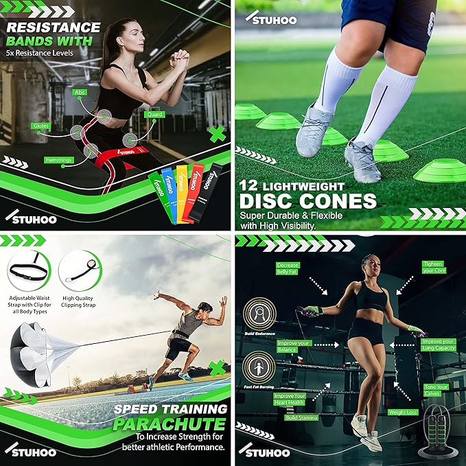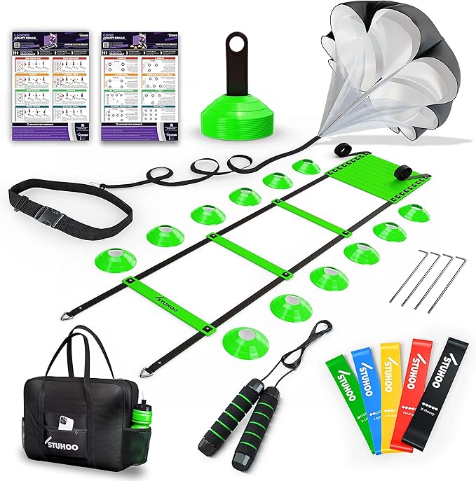 • 【The Perfect Agility Training Equipment Set】: STUHOO brings a versatile soccer training equipment that includes 20 ft Agility Ladder, Parachute for speed training, Jump Rope, 5 Resistance Bands, 12 Disc Cones with holder, 2 Double-Sided Drill Guides, & Polyester Gym Bag; our football training equipment comes with a passion to make your life more fitter