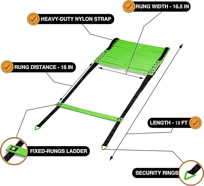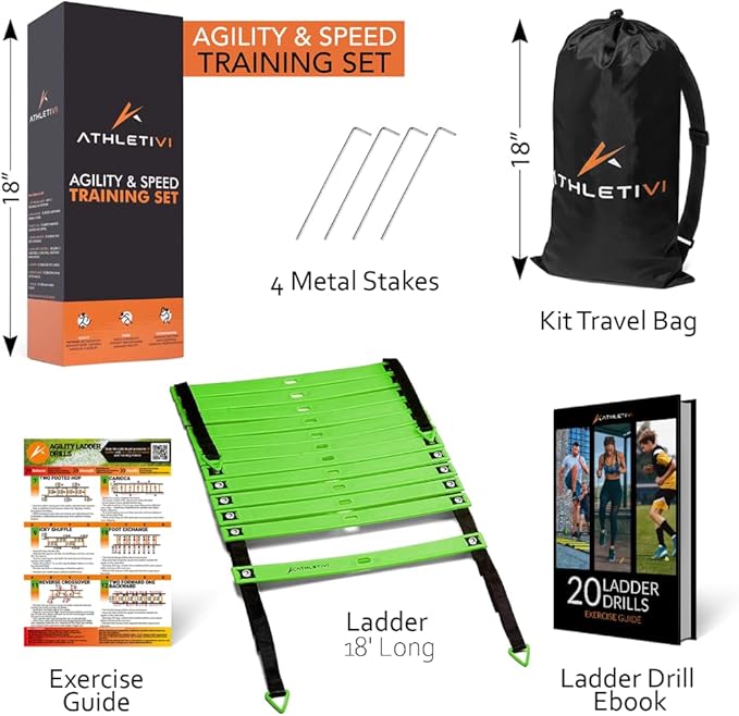 - Elevate Your Game with Athletivi's Premium Football Training Set! Includes an 18ft fixed-rung ladder, 10 agility cones, a running parachute, resistance bands, and more. Perfect for pros, beginners, kids, and anyone looking to improve speed, agility, and coordination.