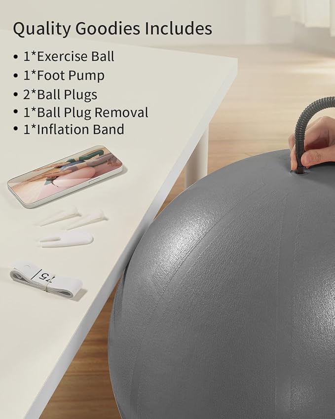 - Looking for a fitness ball that won't leave you huffing and puffing while inflating it? Our swiss ball comes with a foot pump accessory that's as easy to use.No need to worry about low-quality pumps ruining your workout - our pump will get the job done quickly and efficiently. And when it's time to hit the road, just fold it up like a burrito and take it with you. Say goodbye to bulky exercise equipment and hello to the convenience of our yoga ball!