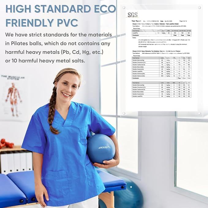 - [SAFE MATERIAL] The 9 inch workout ball is crafted from high-quality, eco-friendly PVC material, these exercise balls physical therapy meet strict standards to ensure safety and durability. They are soft, flexible, and skin-friendly, containing no harmful heavy metals such as Pb, Cd, Hg, etc., or 10 harmful heavy metal salts.
