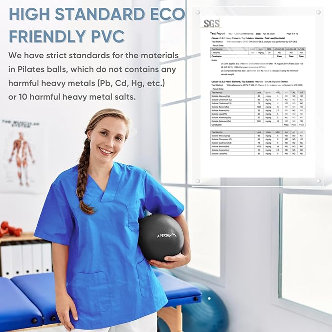 - [SAFE MATERIAL] The 9 inch workout ball is crafted from high-quality, eco-friendly PVC material, these exercise balls physical therapy meet strict standards to ensure safety and durability. They are soft, flexible, and skin-friendly, containing no harmful heavy metals such as Pb, Cd, Hg, etc., or 10 harmful heavy metal salts.