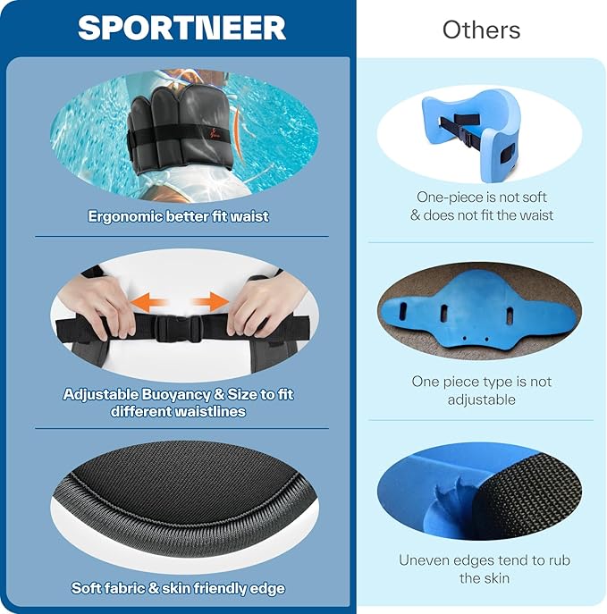 • Soft & Comfortable Fabric: Sportneer flotation belt adopts polyester composite fabric to wrap EPE pearl cotton, which is skin-friendly and comfortable. The webbed part is made of high quality nylon, which improves the service life of the product.