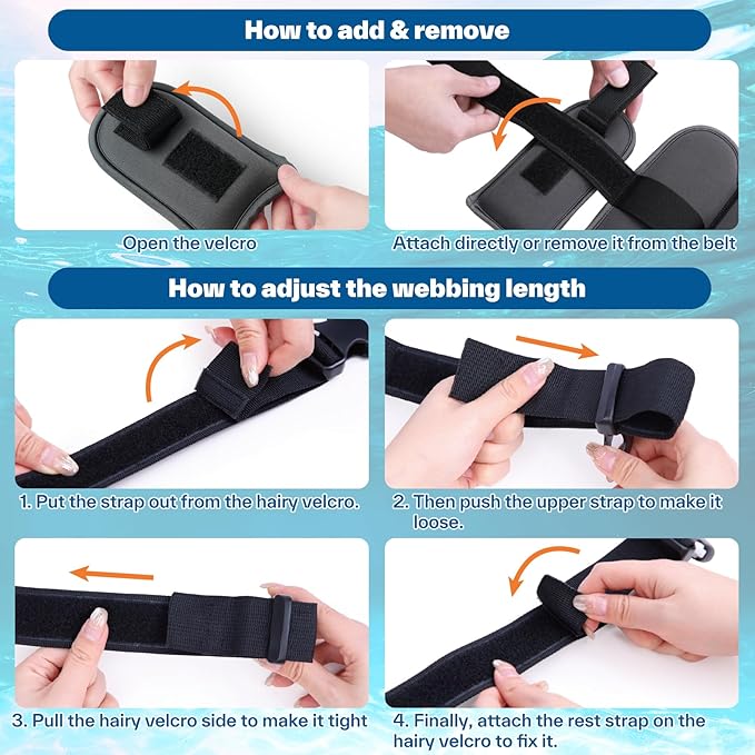 - Adjustable buoyancy: The aqua belt has 6 buoyancy blocks which can be freely disassembled and assembled to adjust the buoyancy. The more floating blocks, the more buoyancy. The sticky webbing hook design on the buoyancy block can be freely installed and disassembled, which improves the convenience of adjustment. (Patent Pending)