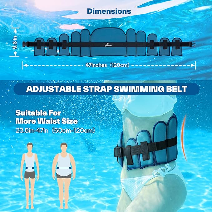 - Great Aquatic Exercise Belt: The water jogging belt adjustable webbing is designed with high-quality waterproof sticky webbing and buckles to make it easy to slip on and off. And the total length of the floatation belt is 47 inches, the waist can take into account the range of 23.5in-47in, suitable for a wider group of people to use.