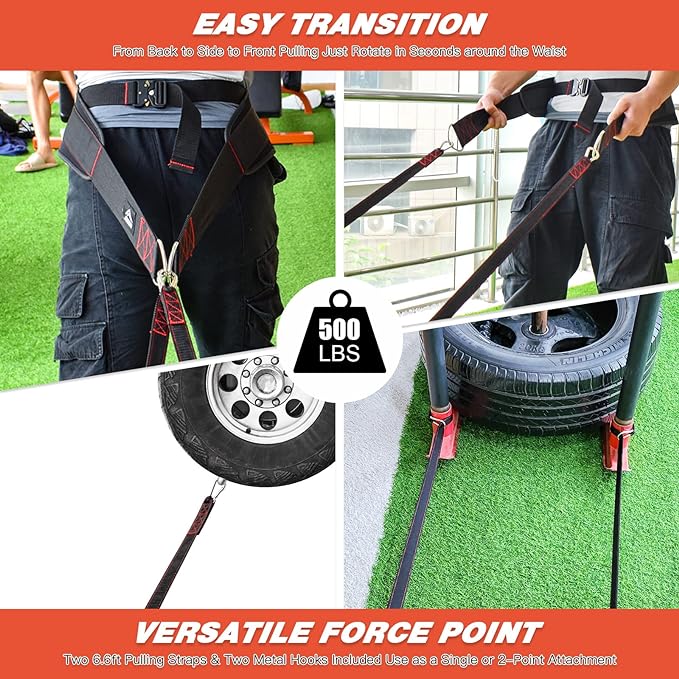 - 🏃♂️ A Full Body Workout : Works as a pulling workout, no matter what you pull, improve work on speed acceleration, speed, conditioning, and strength. In addition to working out on your hamstrings, quads and calves, weight pulling and resistance training are great exercises for a full body conditioning workout and will help you in building your core and lower body strength, improving speed and agility, sustaining your stability and balance, building muscle and much more.