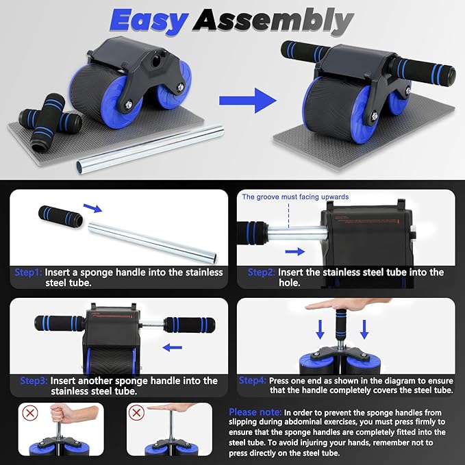 - 💪【High-Quality Ab Roller Wheel】The automatic rebound abdominal wheel is made of stainless steel, plastic and sponge.The triangular structure design and thickened steel tube provide a weight capacity of up to 440 pounds, meeting the needs of most fitness enthusiasts;The two wheels are made of tire-like material, ensuring no noise or floor scratches.The thickened sponge handles are sweat-absorbent, non-slip,and provide a more comfortable abs exercise experience.