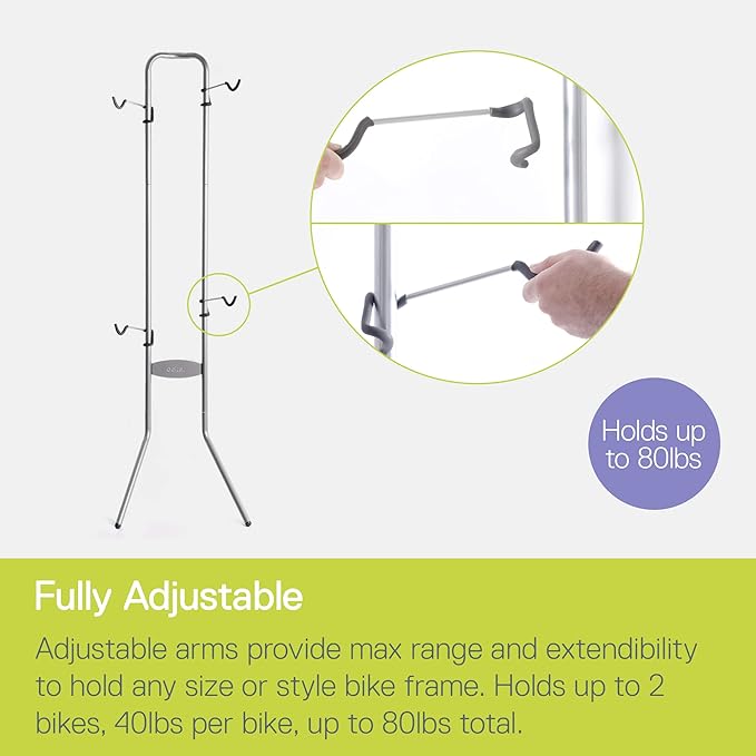 - Fully Adjustable Space Saver: The rack’s super small footprint saves space by storing your bikes vertically. Ideal for an apartment, home, or garage. Adjustable arms are built to accommodate any bike style up to 40 lbs.