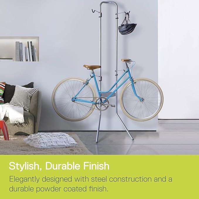 - Stylish, Durable Finish: This rack is elegantly designed with steel construction and a durable powder-coated finish to complement any interior or garage space. Durable rubber feet keep this free-standing bike rack securely in place.
