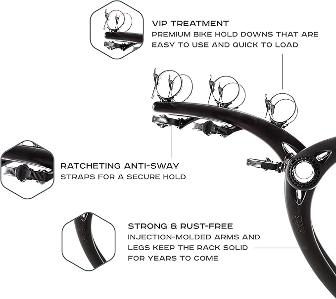 - CAPACITY: Carries 3 bikes (35lb/bike), ratcheting anti-sway straps for a secure hold