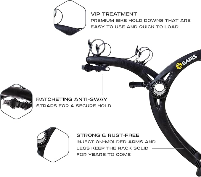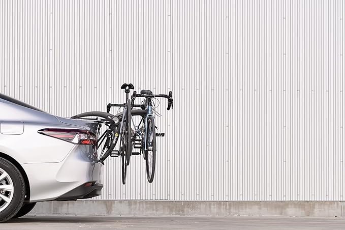 - UNIVERSAL COMPATIBILITY: Designed to fit most vehicles, including those with spoilers. Rubberized feet protect your car's finish while coated straps safeguard your bike. Supports up to 2 bikes, each up to 35 lbs. Ratcheting anti-sway straps ensure a secure and stable hold for each bike.