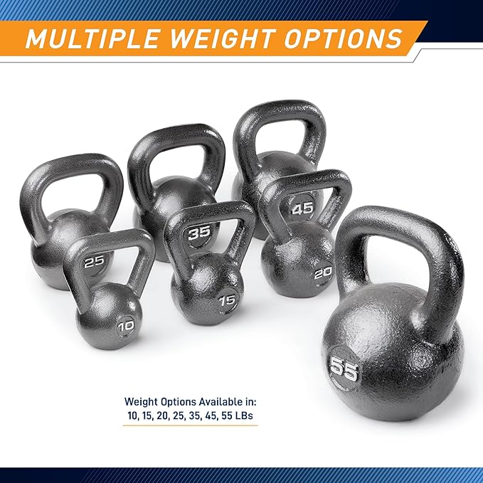 - Kettlebell Sizes: This kettlebell is available in 10, 15, 20, 25, 35, 45, and 55 pounds to allow you to customize your training according to your needs. Each piece of equipment is cast to a precise weight for safe and efficient weightlifting exercises.